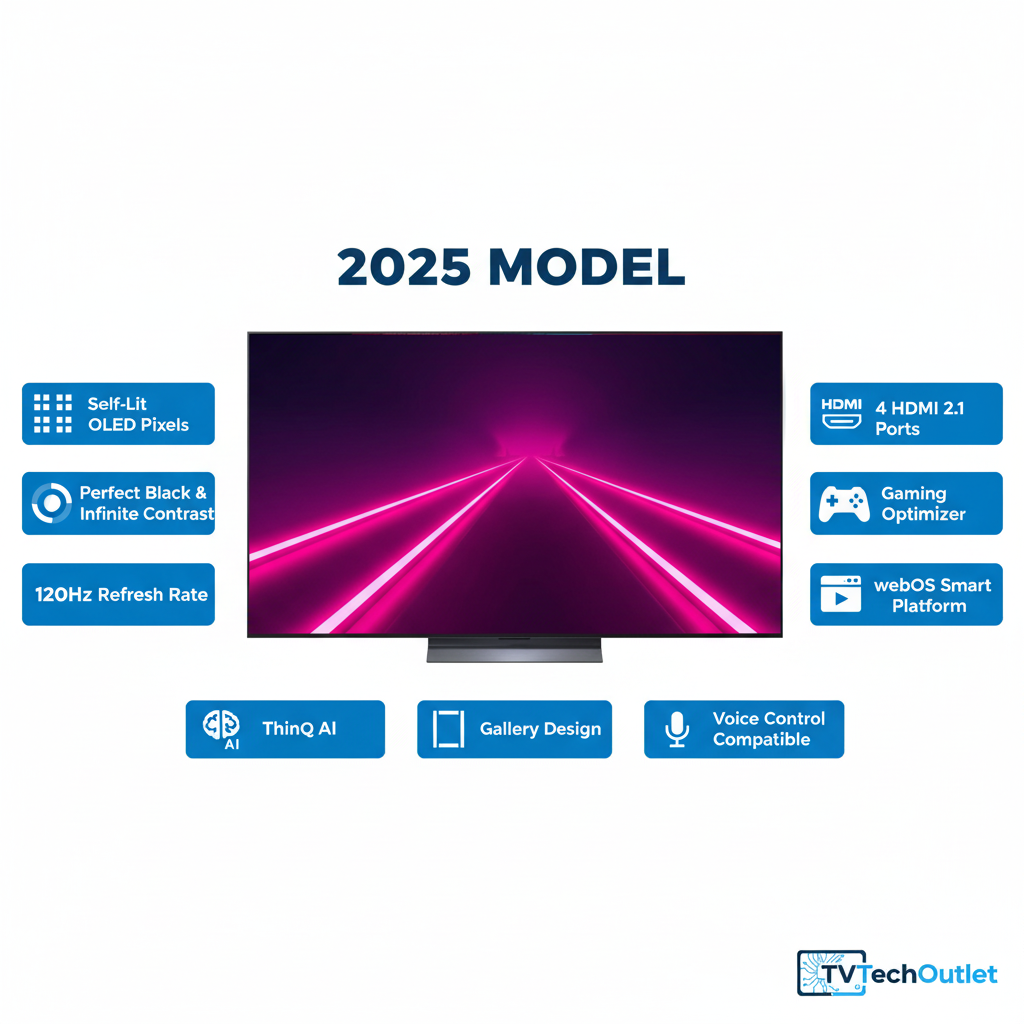 Details: LG’s Most Popular OLED TV.¹ Now Even Better. Experience ultra-realistic picture and sound with the LG OLED evo C5-Series, powered by the exclusive α9 AI Processor Gen8. Boosted brightness and high contrast ensure a stunning view—even in well-lit rooms. AI-assisted deep learning adjusts picture and sound to suit your content and preferences. With its nearly invisible bezel, the C5 blends into any space—and becomes a statement piece with Art Gallery mode for artwork, photos, and more.² The latest LG webOS 25 platform helps you search less and stream more, featuring the next generation of AI technology.⁵ Every LG OLED TV includes Dolby Vision and Dolby Atmos for breathtaking visuals and immersive sound.³ Plus, FILMMAKER MODE lets you experience movies as the director intended. Engineered for gaming, the C5 boasts a 0.1ms response time, native 120Hz refresh rate, VRR up to 144Hz⁴ for PC gaming, and four HDMI 2.1 ports for all your devices.⁴ ¹Source: Omdia. Unit shipments, 2013–2024. Results are not an endorsement of LG Electronics. Any reliance on these results is at the third party’s own risk. ²Image quality of upscaled content will vary based on source resolution. ³Dolby, Dolby Vision, Dolby Atmos, and the double-D symbol are registered trademarks of Dolby Laboratories Licensing Corporation. Manufactured under license from Dolby Laboratories. Confidential unpublished works. Copyright 2012–2025 Dolby Laboratories. All rights reserved. ⁴PC with 144Hz graphic card required. ⁵Internet connection and subscriptions to streaming services are required; number of LG Channels subject to change. Software update will automatically download. Consumers who disable “auto-update” will receive a pop-up notification to accept or deny software update. ⁶Google is a trademark of Google LLC. Google Assistant is not available in certain languages and countries. Apple, the Apple logo and HomeKit are trademarks of Apple Inc., registered in the U.S. and other countries. ⁷Subscription and compatible gaming controller are required.